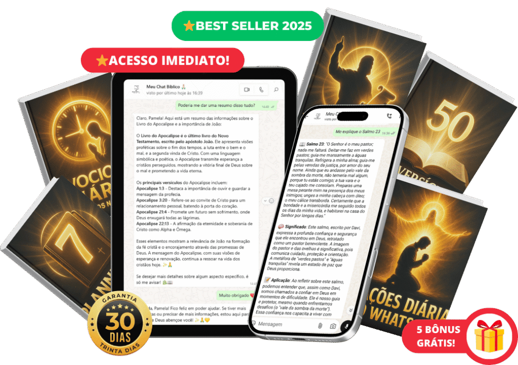 Assim que o seu pagamento for concluĂdo, enviaremos um email e um whatsapp com todos as informaçÔes para vocĂȘ usar o Chat BĂblico no seu WhatsApp e pegar os materias bĂŽnus!