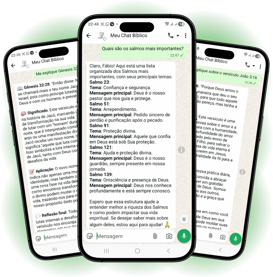 Ă simples assim: vocĂȘ envia qualquer versĂculo ou dĂșvida sobre a BĂblia no WhatsApp e recebe a explicação totalmente fiel, clara e prĂĄtica em atĂ© 15 segundos.